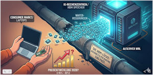 Der entscheidende Engpass: Die Hersteller nutzen für beide Welten dieselben grundlegenden Wafer-Kapazitäten. Schätzungen gehen davon aus, dass die KI-Sparte bereits wachsende zweistellige Anteile der Wafer-Produktion im High-End-Segment beansprucht. Hinzu kommt das sogenannte Advanced Packaging: Die komplexen Verfahren, die nötig sind, um HBM-Speicher mit Rechenchips zu stapeln, binden wertvolle Fertigungsressourcen, die dann für die Produktion von Standard-Komponenten fehlen.